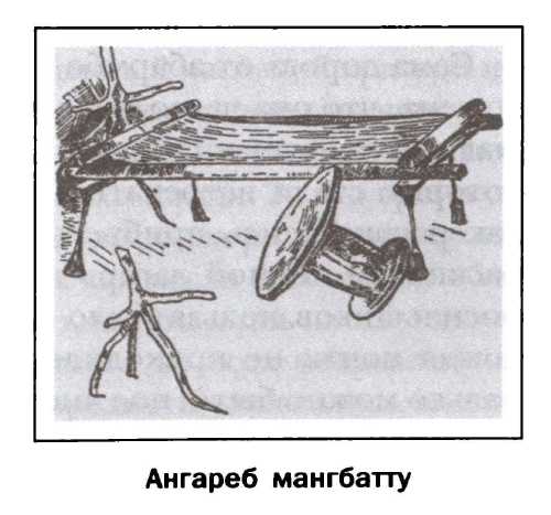 Деревянный барабан мангбатту и сигнальные рожки