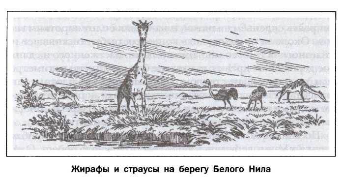 Жирафы и страусы на берегу Белого Нила