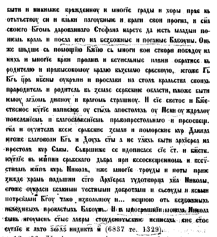 19. Рукопись 40 пр. б. заключает: месяца октяб. 30 д. Стефана краля, служба ему; ноемврия м. 11 д. служба святому Стефану Дечанскому; житие св. великомученика Стефана Дечанскаго; списано Григорием мнихом и пресвитером игуменом бывшем тояже обители; житие Георгия нового мученика 11 д. февраля: житие св: Петра в хвостне. [31]
