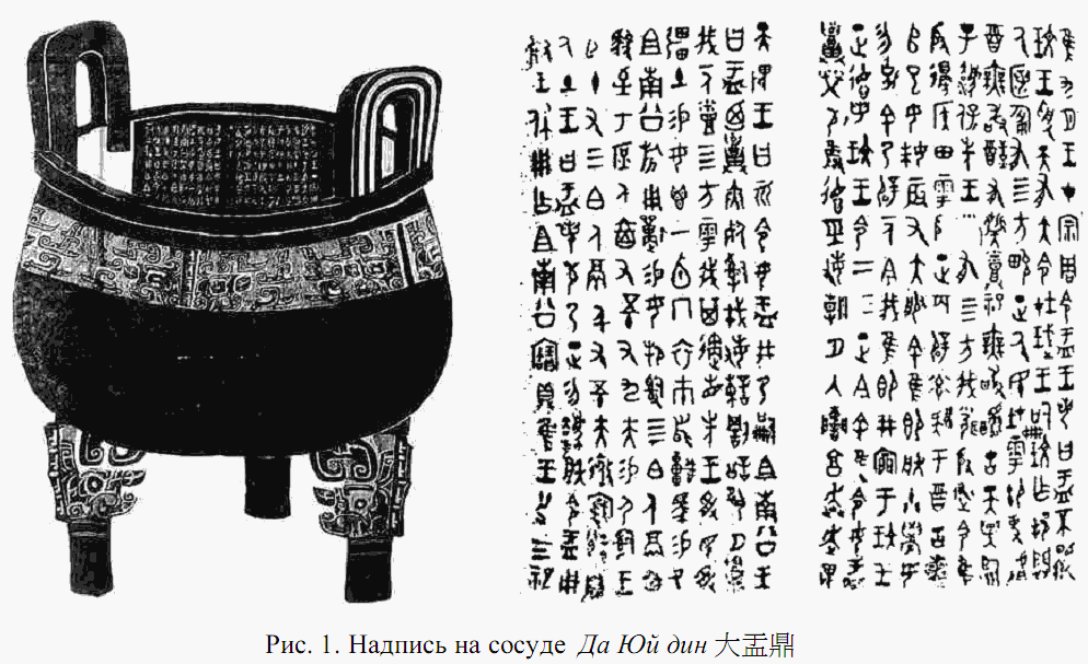 Надпись на найденном в 20-х годах XIX в. в китайской провинции Шаньси и находящемся ныне в Шанхайском Музее ритуальном сосуде Да Юй дин 大盂鼎 («Большой треножник Юя») давно является предметом изучения специалистов, занимающихся китайской древностью. Надежно датирующаяся гранью XI-X вв. до н.э., данная инскрипция представляет собой бесценный источник сведений о древнекитайской системе религиозных представлений и связанных с ними ритуалах, концепции царской власти, практике делегирования царями своим вассалам жреческих и административных полномочий, церемонии инвеституры. [33]