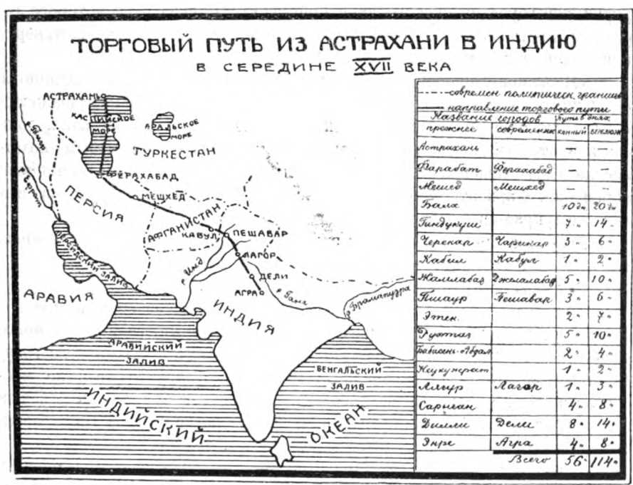 В середине XVII в. Россия пыталась завести торговые и дипломатические сношения с Индией. В 1646 г. (7154 г.) по указу царя Алексея Михайловича был отправлен на Восток астраханский купец Анисим Грибов. Из отрывка наказа, помещенного в его статейном списке (журнале), видно, что ему велено было ехать с товарищами в Бухару, Ургенч (Хиву) и в Балх к царю Недыр Магомету с царскими грамотами и государевой купецкой казной. Грибов должен был отправиться из Астрахани в Ферахабад («Фарабат») морем, далее сухим путем в Астрабад, Мешхед, Мары и др. места. По прибытии к средне-азиатским ханам Грибову с товарищами велено было «править» поклон от царя Алексея Михайловича, известить о смерти Михаила Федоровича, выразить пожелание нового царя быть с ханами в братской дружбе, любви и в ссылке, просить об отпуске в Россию русских пленников и т. д. Затем им было наказано, что если в Бухаре «стало безгосударно» и можно будет исторговаться с прибылью в шахской земле, то им оставаться в Персии. Дорога, которой ехал Грибов (на Ферахабад морем) была необычайная, как видно из слов ферахабадского начальника Мурзы Касима, обращенных к приехавшим купцам, что «наперед сего» от царя через Персию на Ферахабад в Бухарскую и Балхинскую земли послы, посланники и купцы никогда не ездили. Ферахабадский начальник отказал Грибову в его просьбе пропустить его в Мешхед, говоря, что без шахова указа этого нельзя сделать. Одновременно он сообщил, что ехать в Ср. Азию с царской товарной казной «никоими мерами неуместно», так как в тех краях «учинилось большое смятение». Эти сведения подтвердились, так что Грибов с товарищами, по получении шахского указа отправились в Исфагань, где им разрешили торг по всей Персии. В то же время они отправили гонца в Москву с известием о своем положении. Ответ, полученный из России, одобрил их действия, наказывая не ездить в Среднюю Азию «за смятением», но оставаться торговать в Персии, а затем вернуться обратно. Продав товары, Грибов с товарищами просили [148] отпустить их в Россию тем же путем, через Ферахабад. Когда они приехали в упомянутый город, к ним была прислана шахская грамота, где говорилось, что Балхинский царь Недыр Магомет прислал к шаху своих послов с просьбой отпустить в Балх царских купцов «с послом его вместе безо всякого задержания». Шах сообщил, что если купцы хотят, он их отпустит в Балх, так как там кончилась смута, и Недыр Магомет «учинился на своем месте по-прежнему царем». Тогда Анисим Грибов со своими товарищами стали разведывать, можно ли проехать в Балх с государевой казной. Результаты были отрицательные. Ехать туда было опасно и невыгодно, так как с место стало разореное, самое бедное, жен его Недыр Магомета царя и детей и многих Балхинских людей поймали индейские люди, а остались ныне в Балхе с Недыр Магометом царем невеликие люди, и те бедны и нужны; да и жаловать их царю стало нечем и присылали шахову величеству займовати денежные казны 300.000 тюменей, а в тюмене русских денег 10 рублев». В виду этого, а также вследствие «смертной недружбы» между Недыр Магометом царем и его сыном, Грибов опасался, как бы над ним с его товарищами и над государевыми поминками «какова дурна не учинить» и царскому имени «какова поносу не было». Поэтому, посоветовавшись между собой, они решили ехать обратно в Москву.