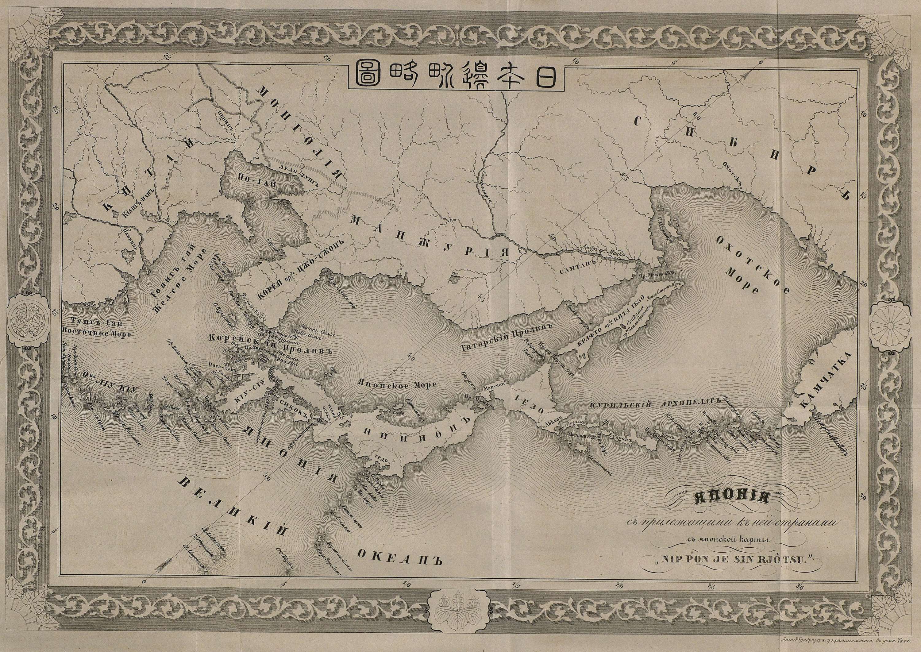 Приложенная к сему карта Японии, есть копия и перевод с карты, изданной в Иедо в 1820 году придворным астрономом Takahasi Sakusajemon; она может служить доказательством развития Японцев в науках и примером художественной отделки географических работ. Оригинал вырезан на меди и носит название: Nippon je-sin rjo-tsu т. е. Япония с соседними землями в уменьшенном масштабе. Исключая северовосточной части азиатского материка, Камчатки и русских владений, карта эта составлена по собственным наблюдениям Японцев и отличается тем, что первый меридиан проведен через древнюю столицу Миако, лежащую в долготе от Гринича 135° 40' к востоку.