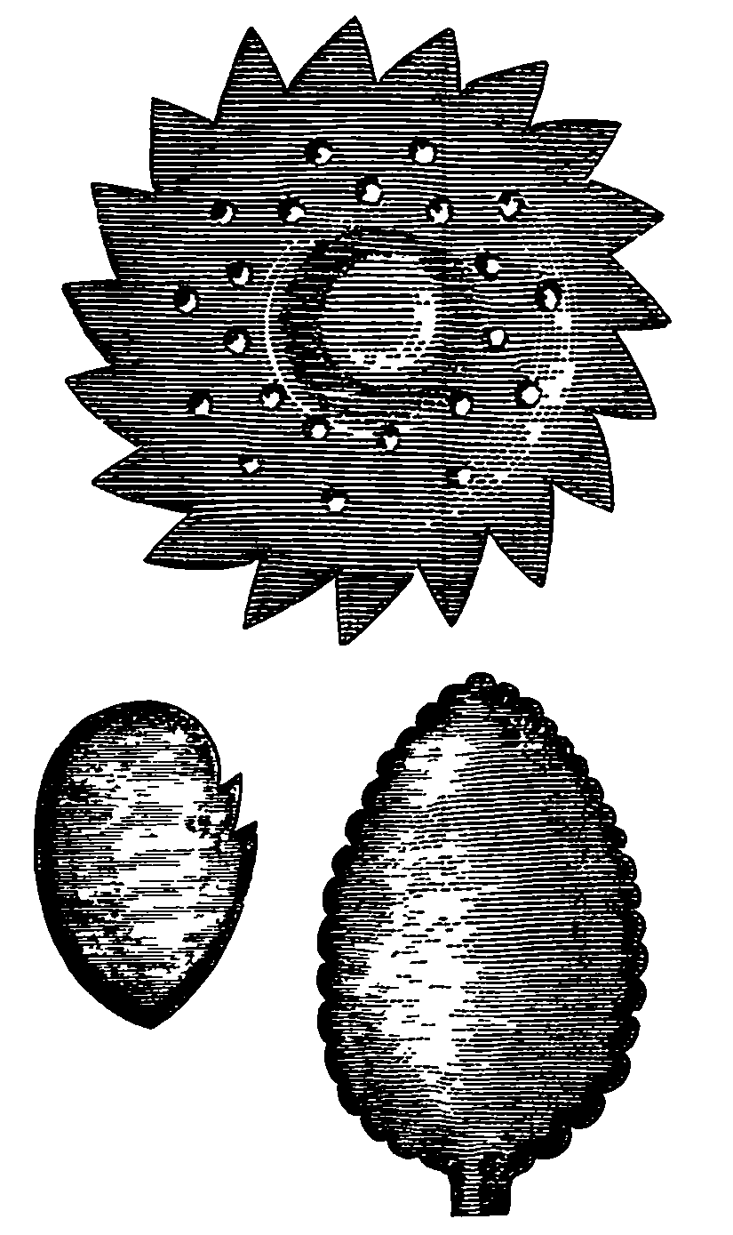Из этих фигур в кругловатой, которая с одной стороны плоская, а с другой несколько [757] выпуклая, в средине замечено подобно глазу весьма твердое вещество, а далее от него в краям небольшие островатые пупырышки; по самым же краям зубцы. Несколько градин замечено более и менее различных фигур. На другой день после дождя выпал град величиною в терновую ягоду; на третий и четвертый сначала пошел небольшой град, а потом увеличился в куриное яйцо, отчего испорчено: хлеба 4,831 четвертей 2 четверика, мельниц 3, мостов 2 и кибитка 1, да побито скота: рогатого 50 штук, овец 300, лошадь 1, ослов 8, и жители понесли убытка на 14,383 р. 1272 к. с.