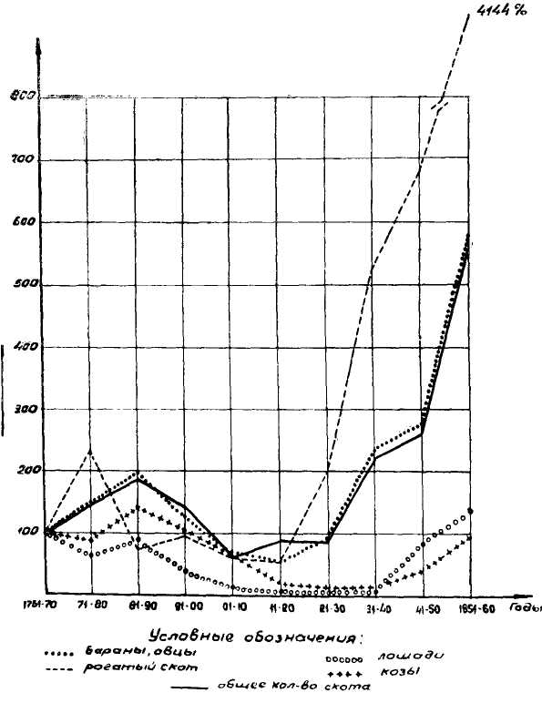 В графике под 100% за 1761-1770 гг. имеется в виду вывоз скота в натуральном выражении: баранов и овец 1219207 голов, рогатого скота 8475 голов, лошадей 50562 головы и коз 63176 голов.