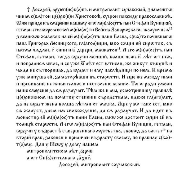 Однако отношения Елены с мужем к этому времени были далеко не [445] безоблачными. Бесценные подробности об этом мы узнаем из уникального источника — грамоты, выданной в Яссах сучавским митрополитом Досифеем 8, о расторжении брака Стефана и Елены Куницких.