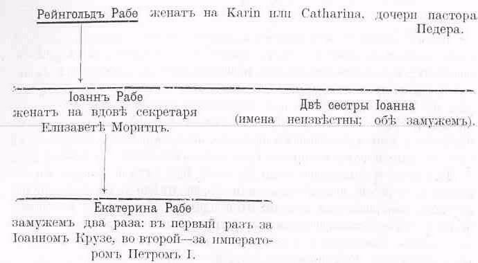 Иоанн Рабе, шведского происхождения, женился в Риге на вдове секретаря Елизавете Моритц, родившейся в том же городе и принадлежавшей к мещанскому сословию 39. Этот Рабе впоследствии прибыл в Швецию и был принять на службу в полк полковника Свена Ранка, в Хальмста 40, а затем сделан полковым квартирмейстером при Эльфсборгском полку. В 1682 году у означенного квартирмейстера и его супруги родилась дочь, названная Екатериной и появившаяся на свет в Эльфсборгском лене, Ронгндальской общине 41 Тоарпском приходе, в бостели полкового квартирмейстера, Гермюнделунде. По смерти отца, вдова его отправилась в Ригу, где Екатерина сперва была отдана в Weisen-huset (сиротский дом) 42. Отсюда она попала к пастору Глюку в Лифляндии 43 и у него вышла замуж за одного капрала кавалерии, но сразу же затем была взята в плен русскими генералом Вермиковым и привезена ко двору князя Меншикова, который представил ее царю. Последний..., спустя некоторое время, взял ее в царицы, а под конец соизволил короновать императрицей.