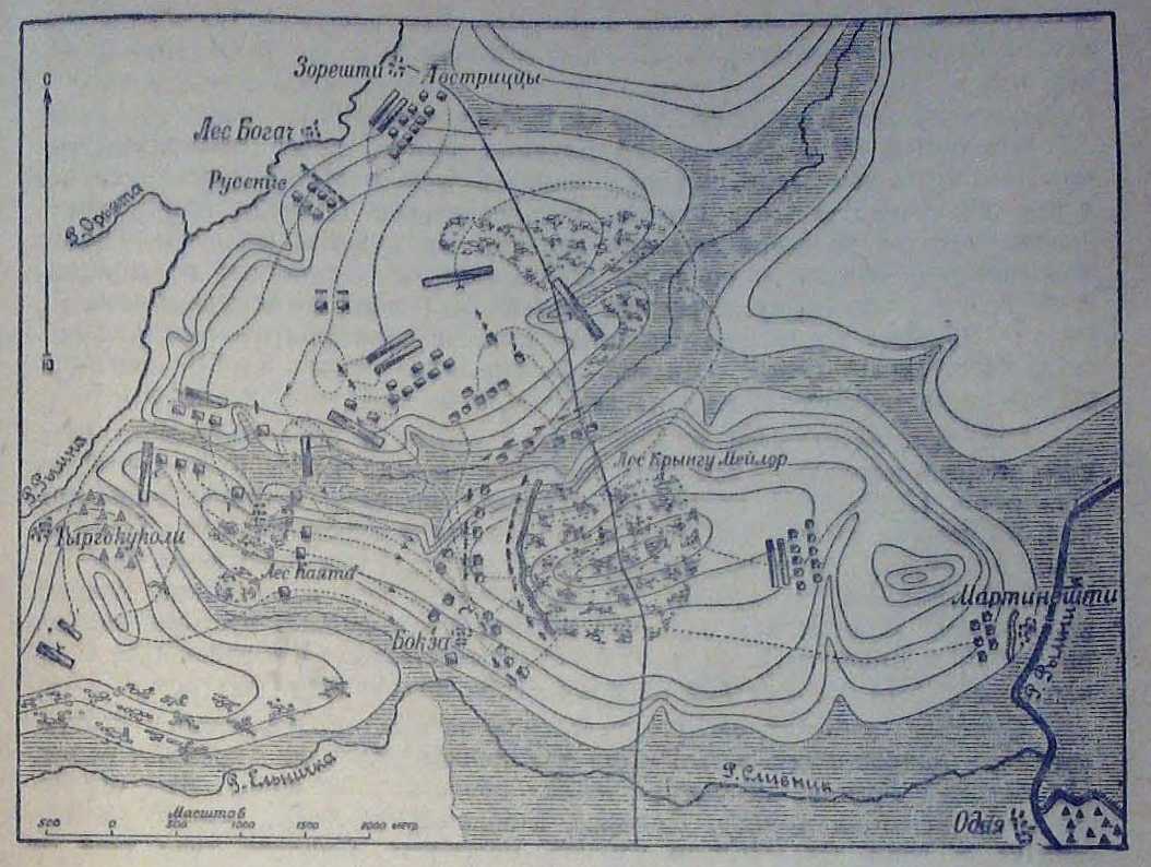 — союзные войска, перейдя р Рымну двумя колоннами, стали в боевой порядок: русские по правую сторону, австрийцы по левую В — русский корпус и несколько австрийских эскадронов качали наступление на первый турецкий лагерь у леса Тыргокуколи; С — бригада ген Карачая, назначенная для связи между обоими корпусами; D — турецкая конница нападает на левый Фланг русских; FF — турецкая конница обретена в бегство перекрестным огнем русского каре и конницы Карачая; G — русские каре и конница Карачая подошли к турецкому лагерю, несмотря на жестокий огонь батареи Н; J — турки отбиты от лагеря и батареи, но скрываются в лесу, а часть отступает к К, преследуемые конницей и 2 каре русских; М — русские егеря выбывают турок из леса Каяту, которые бегут N к лесу Крынгу-Мейлор; О — временная передышка русских войск около высоты; P — нападение турок на австрийские войска; S — новая позиция австрийских войск после турецкой атаки; Q — ретраншемент в Крынгу-Мейлорском лесу, занятый янычарами; R — турецкая конница, прикрывавшая оба крыла; Т — конная атака турок на Карачая, UV — перекрестный огонь австрийских и русских каре, оптразивший турецкую атаку; Y — Суворов направляет русские войска от Л и X в обход турецкой батареи у дер. Бонна; Z — соединенные русские и австрийские войска атакуют турецкий рентраишемент. Русская конница атакует укрепление в конном строю, опрокинув турецкую конницу: Аа — оба корпуса преследуют турок за лес; Вb — русские войска овладевают 3-м турецким лагерем при Мартинешти; Сс — русские войска берут последний 4-й турецкий лагерь за Рымником, оставленный турками ночью.Схема построения войск Суворова при Рымнике