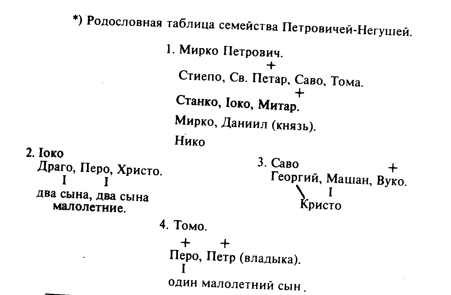 Прекрасное, полное описание Черногории г-на полковника Ковалевского, служа верным руководством новому посетителю страны, избавляет его в тоже время от труда изображать картины черногорской природы, представлять нравы жителей и все то, что должно и не может иначе быть как оставаться неизменным, неприкосновенным. Но мне еще возможно пополнить оное приложением родословной таблицы? семейства Петровичей-Негушей, родственников князей Черновичей. Из нее можно будет усмотреть, что Даниил, имея права на власть по безбрачию в звании митрополита, как светский правитель уступает их по рождению старшему своему брату Мирко, от которого они переходят к единственному сыну сего последнего Нико, воспитывающемуся ныне в Триесте с надеждою получить окончательное образование в С.- Петербурге. Известным мне родоначальником Петровичей, не считая владыки Даниила, современника императора Петра I, был Марко Петрович-Негуш, имевший четырех сыновей, как значится в упомянутой таблице *.