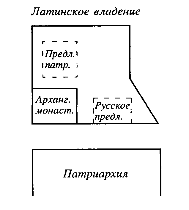 чтоб понять разницу в предложениях Патриархии от предложений русских. Эти последние, по словам Базили, предполагали выстроить дом для Миссии на улицу, имея, таким образом, независимый выход. Патриархия между помещением Миссии и улицею оставляла Архангельский монастырь, чрез который должен был проходить вход в дом. Кроме того, предложенное Патриархиею место граничило с латинянами, которые, конечно, во-первых, вмешаются насколько возможно, чтоб воспрепятствовать самой постройке, и, во-вторых, никоим образом не позволят ей распространиться за пределы Архангельского монастыря, не продав, конечно, ни пяди земли ненавистным им схизматикам. А что такие предложения витали в голове наших константинопольских дипломатов, то это видно из продолжения того же письма нашего поверенного в делах. «При таком устройстве (то есть вышеприведенном соглашении) оставалась, — пишет он, — утешительная надежда, что в Святом Граде, на месте, признанном самим Патриархом удобным, будет устроена отдельная русская обитель, которая в отдаленное более благоприятное время может расшириться и украситься собственною отдельною церковью, по сломке ближних домов, принадлежащих монастырю Святого Гроба, и по крайней бедности обывателей доступных к приобретению покупкою за весьма незначительную цену... Само собой разумеется, — присовокуплял он, — что таковой взгляд на будущность не был сообщен Патриарху». А сей последний — прибавим мы — должно быть, не догадался. Невольно возбуждается вопрос: кто кого и к чему обманывал?