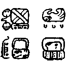 — передано тремя знаками. Первый знак обозначает долгое а, но употребляется в качестве слогового знака аак (аак') и встречается очень редко (в словах аак'ил,[78] аак'аан, аак'нак, производных от корня аак' — "свежий", "новый"). Второй и третий знаки передают краткое а и тоже принадлежат к числу очень редких. Третий знак, по-видимому, мог употребляться в качестве местоименного префикса 2-го лица. Первый знак изображает голову черепахи (аак), второй знак — мужской орган (ач), третий знак — лист (ак?).