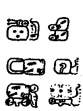 — передано знаком, который встречается почти исключительно в имени бога войны (бог F, по Шелльхасу). [80] Вероятно, он обозначал слог п'ак' (ср. имя бога войны Пак'-ок). Знак изображает лицо в профиль с вписанным другим знаком (черты и точки), который встречается и самостоятельно и имеет фонетическое значение пок'(пак).