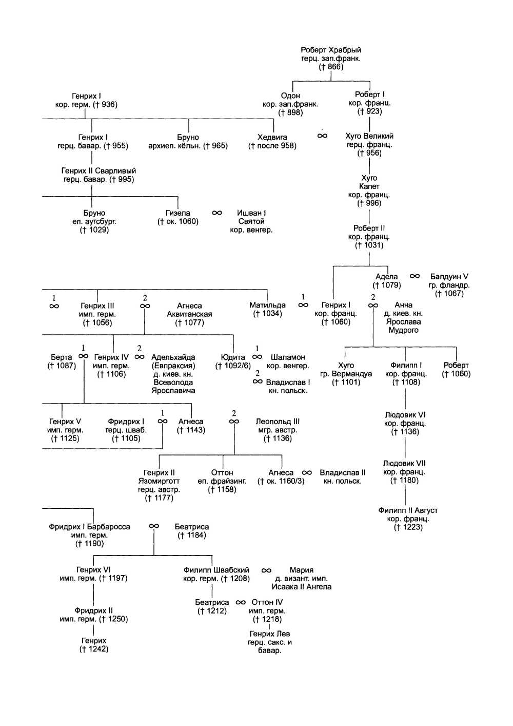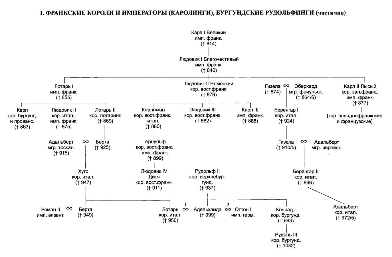 Определенную терминологическую трудность представляет различение между «западнофранкскими» и «французскими» и, соответственно, между «восточнофранкскими» и «германскими» королями, которое связано с рядом разноречивых условностей в историографии. Сознавая, что налицо тенденция употреблять первую пару терминов на протяжении всего X в. (Оттон II — еще «восточнофранкский» король, тогда как его сын Оттон III — уже «германский», «немецкий»), все же предпочитаем проводить эту условную грань, ориентируясь на конец династии Каролингов в Восточнофранкском королевстве в начале X в.; в таком случае последним «восточнофранкским» королем остается Людовик IV, а Конрад I и Генрих I делаются уже «германскими». В силу сказанного из первых Капетингов Одона (ум. в 898 г.) условно именуем еще «западнофранкским», а его брата Роберта I (ум. в 923 г.) — уже «французским