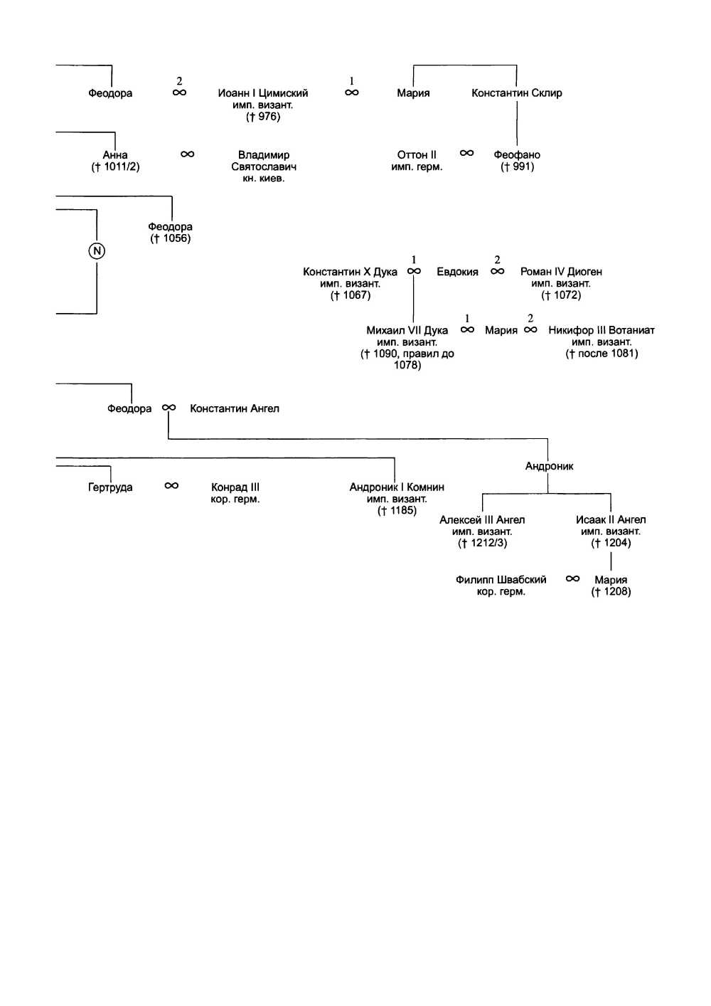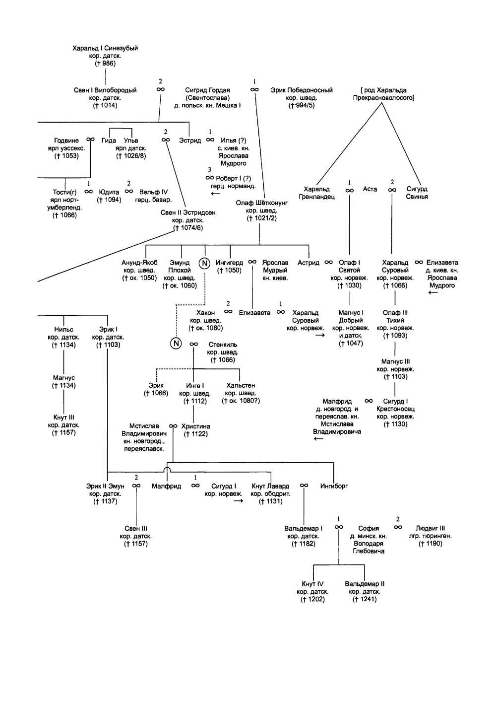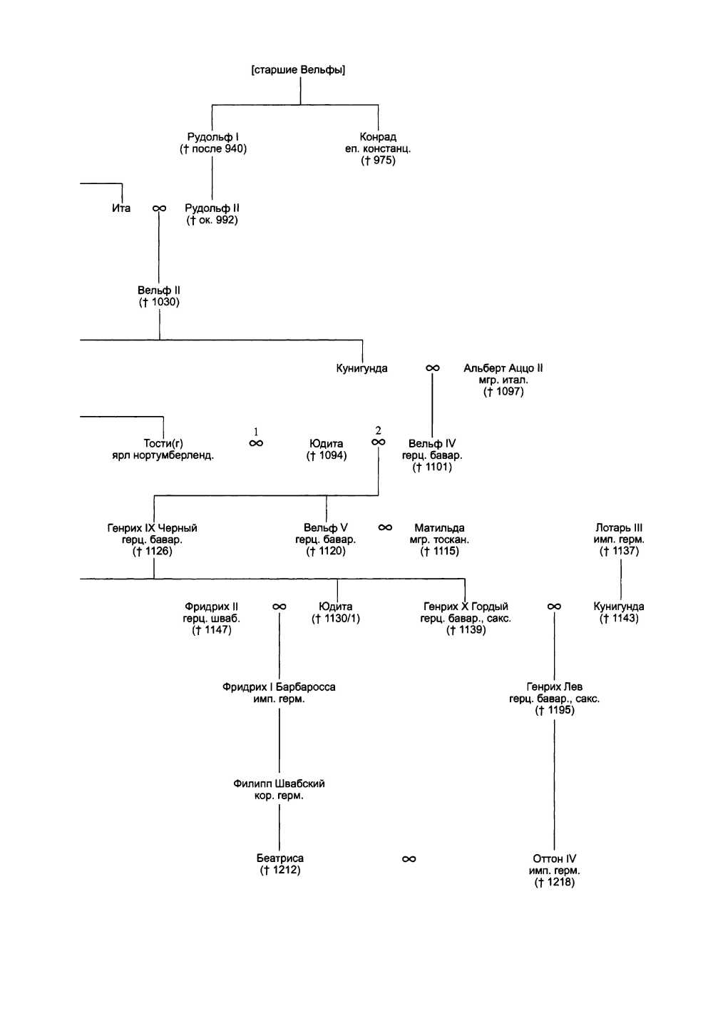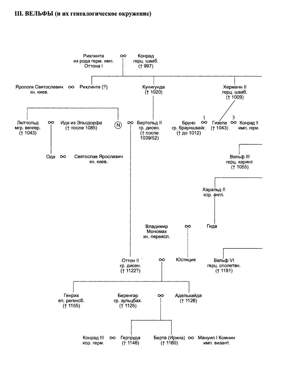 Легенды при именах — предельно лаконичны. Из хронологических указаний приводится только дата смерти; следует помнить, что она не всегда совпадает с датой окончания правления (если речь идет о короле, [374] князе и т. п.). Дата присутствует только при упоминании имени в главной для него таблице; при повторных упоминаниях (если они есть) в других таблицах она опущена. Например, дата смерти англо-саксонской принцессы Гиды, первой жены Владимира Мономаха, приведена в таблице VII, где представлены англо-саксонские короли in summa; при упоминании же Гиды в родословии русских князей (таблица IXb) этой детали нет. И наоборот: дата кончины Владимира Мономаха есть в таблице IXb, но ее нет в таблице VII, хотя имя Мономаха названо и там. Больше подробностей читатель найдет в указателе личных имен.