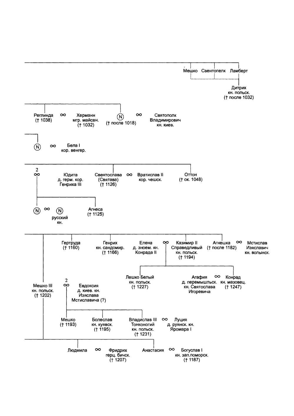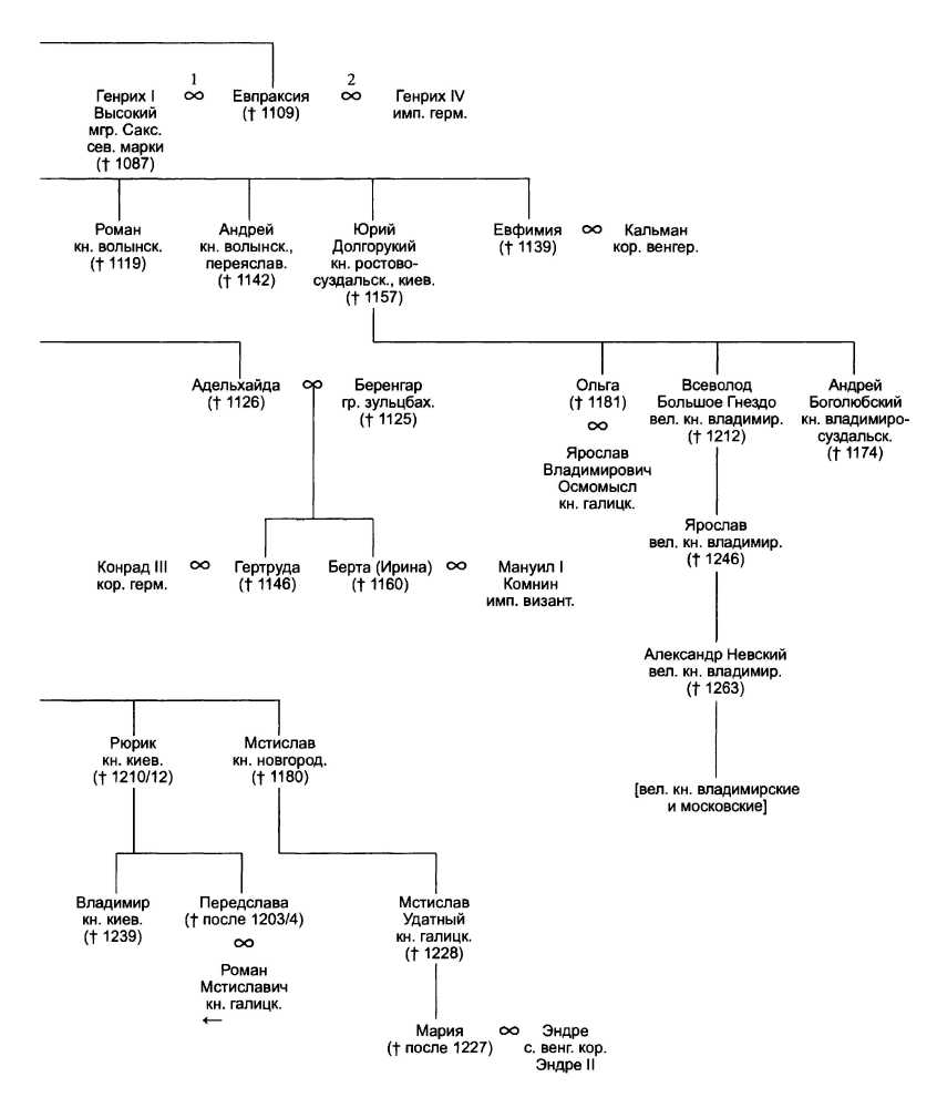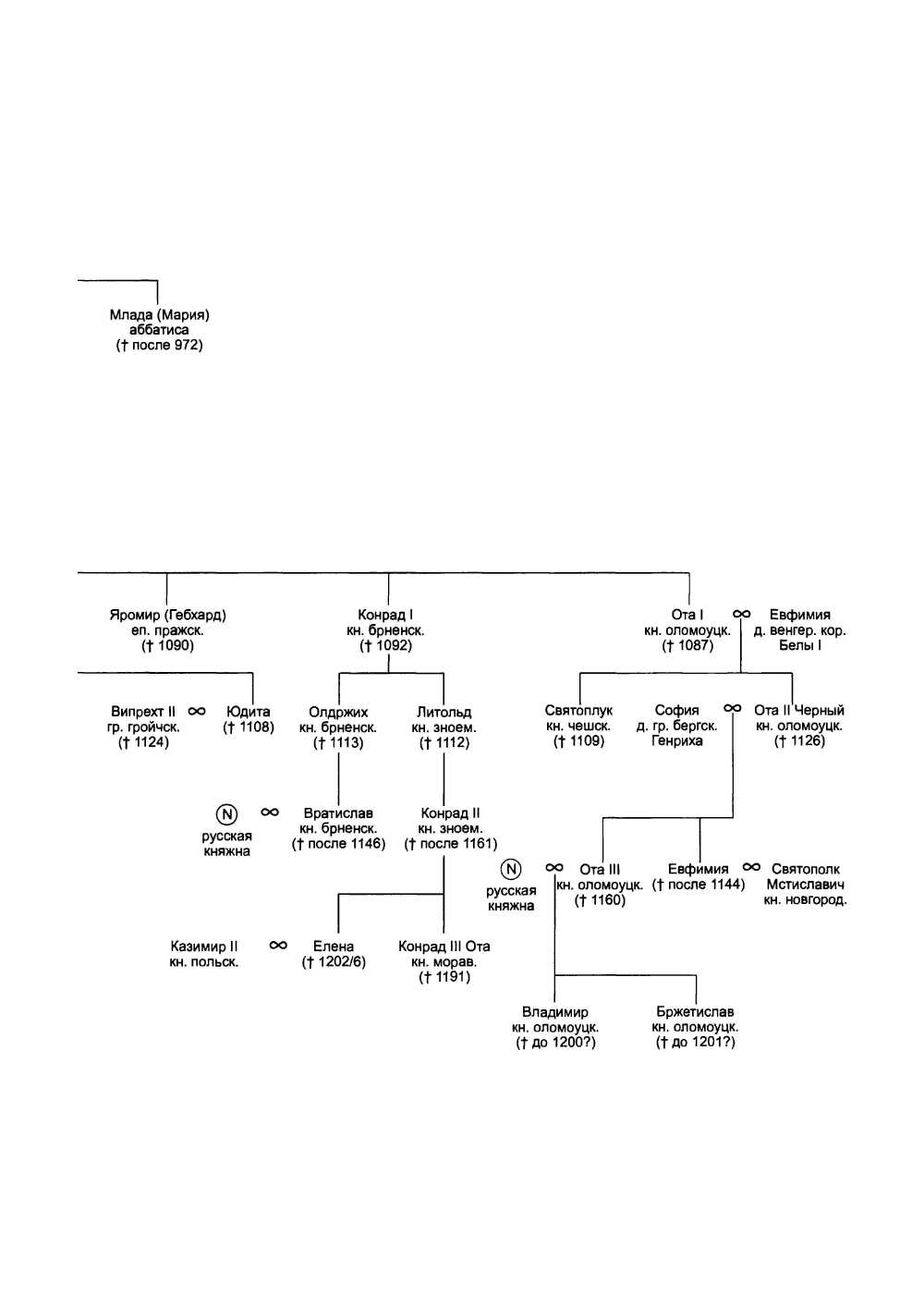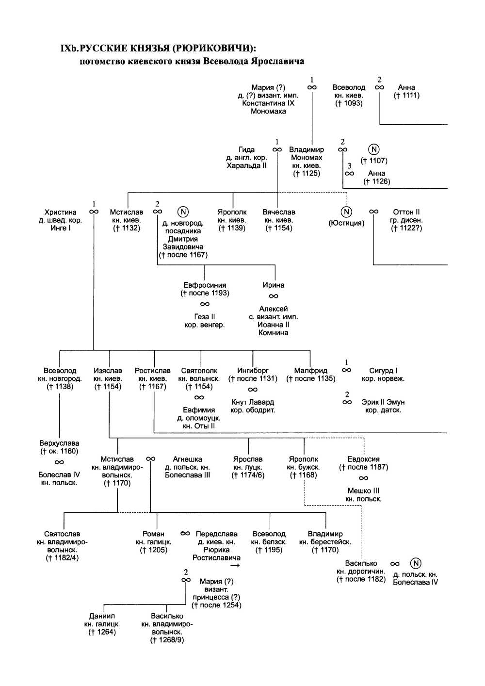 В легенде мы старались, насколько то было нам доступно, учесть актуальный статус названного лица. Иными словами, в таблице VII, где Владимир Мономах фигурирует только как супруг Гиды, он назван князем переяславским, потому что при жизни Гиды Владимир киевским князем еще не был. Но в таблице IXb Мономах обозначен, естественно, как князь киевский.