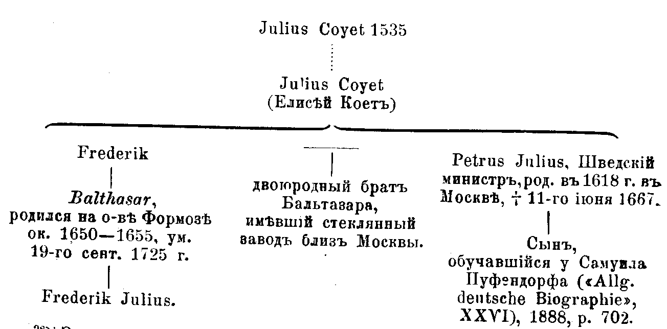 В словаре van der Aa (s. v. ) о Бальтазаре Coyet’е говорится лишь, что он автор книги о посольстве К. Кленка, что, вероятно, приходится сыном Фредерику Coyet’у, и что с 25-го мая 1697 г. по 17-ое апреля 1701 г. он был наместником Банды. При этом автор статьи ссылается на I, 18 первого издания книги Схельтемы, на I, 310,313,347 второго издания и на статью проф. Dozy в «de Gids», 1856, I, 227. В словаре А. Winkler Prins’a (s. v. ) упоминается лишь Coyat Frederik, о котором довольно большая статья и у van der Aa (s. v., p. 802-804). Здесь мы узнаем, что отец Фредерика — Iulius Соуеt был «генерал-фельдценхмейстером» на Русской службе. Сам Фредерик всю почти жизнь провел в Азиатских колониях Нидерландов. Следует отметить, что в 1661 г., когда отстаивалась от нападения Coxing’и Формоза, одним из Нидерландских полководцев (действовавшим, впрочем, очень плохо) был Герман Кленк, очевидно, брат К. Кленка. За потерю Формозы Фредерика Койэта судили, и лишь в 1674, на просьбы детей его к принцу Вильгельму III, его выпустили из тюрьмы. Статья упоминает еще, что брат Фредерика — Petrus Julius, был министром в Швеции и † в Бреде в 1667 г. . О самом роде Койэтов более подробные сведения дает старый словарь Luiscius’a (Het algemeen historisch, geographisch en genealogisch Woordenboek door A. G. Luiscius, rechtsgel. In ‘s Gravenhage, 1726) в биографии [CXVI] Петра Юлия Койэт(т)а. 26 Род этот происходил из Брабанта. Один из представителей его Юлий Койэт(т) в 1535 г. сражался с маврами в Африке и имел орден Золотого Руна. Позже Койэты, спасаясь от религиозных преследований, бежали в Швецию. Один из них Юлий (отец Фредерика), с разрешения короля Карла IX, поступил на службу царя Михаила Феодоровича. Это, очевидно, упоминаемый в книгах Голландского двора «Елисей Коет» (ср. Н. Н. Бантыша-Каменского «Обзор внешних сношений России», І, стр. 179: «1634 г. . . . умер в Москве Швед Елисей Коет, пушечный и колокольный мастер, получавший на месяц кормовых денег по 100 р. ; на место его определен Фрисландец Ганц Фальк. — Сей получал на месяц кормовых по 50 р. и хотя Коета превосходил в мастерстве, но был от бояр утесняем. См. Гол. книгу № 4, лист 369»). В «Armorial general» J. B. Rietsap’а (Gouda, 1884), I, p. 478 упоминается Шведский дворянский дом Coyet’ов, с 1706 г. ставших баронами; дом этот прекратился в 1782 г. . I. Б. Ритсап, впрочем, упоминает и о Голландском роде Соуеt’ов (l. с. I, 444), не отмечая, однако, в какой местности и когда эти Coyet’ы жили. Из текста печатаемой ниже книги вытекает, что около Москвы находился стеклянный завод двоюродного брата (Neef) автора книги. Вероятно, фамилия собственника завода была также Coyet, хотя и неизвестно, тот ли это Julius Coyet, o котором Схельтема, 27 со слов Кильбургера, сообщает, что он имел близ Москвы бутылочный завод (Scheltema, I, 232, Kilburger, 276). Николай Витсен в своем отчете о поездке к патриарху Никону (ср. А. М. Ловягин, «Николай Витсен из Амстердама у патриарха Никона», «Ист. Вест. », 1899, № 9) говорит (fol. 142a): van daar besoghten wy in ‘t voor by gaen de heer Coujet, welck daer omtrent een glasblaserije heeft. . . т. е. «поехав отсюда (из Нового Иерусалима) мы мимоходом посетили господина Куйэта, имеющего здесь по близости стеклянный завод». Это упоминание относится к 1665 г. [CXVII] Весьма возможно, что тот жо Coyet или Coujet стоял во главе завода и в 1676 г. . В печатаемой ниже книге говорится также, что завод был близок к монастырю Иерусалим (ср. // 118). Архивных документов о Бальтазаре Койэте в Амстердамском общинном архиве не отыскано. Не упоминается он и ни в одной из оффициальных бумаг, имевших отношение к посольству. Зато очень