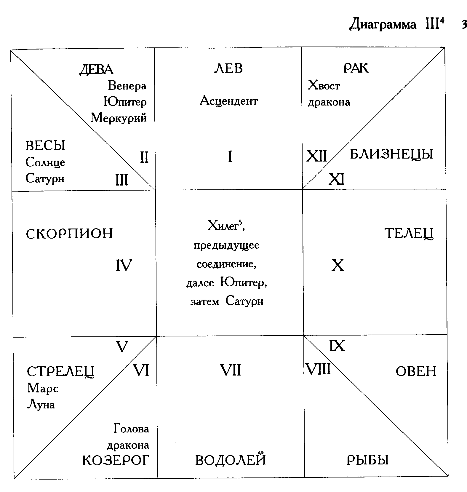 . С первого взгляда кажется, что содержание этой диаграммы неверно, т.к. Меркурий помещен в знак Девы, в то время как в тексте говорится, что он находится в 25° 24' Весов. Точно так же Хвост дракона (Катабибазон) находится в знаке Льва, а не Рака; а Солнце в знаке Скорпиона, а не Весов. Но следует помнить, что границы домов и знаков Зодиака не совпадают. Размещение знака Зодиака в одном из домов означает только то, что куспид дома находится в этом знаке. Первый дом, например, начинается только у последнего градуса (28°) Льва.