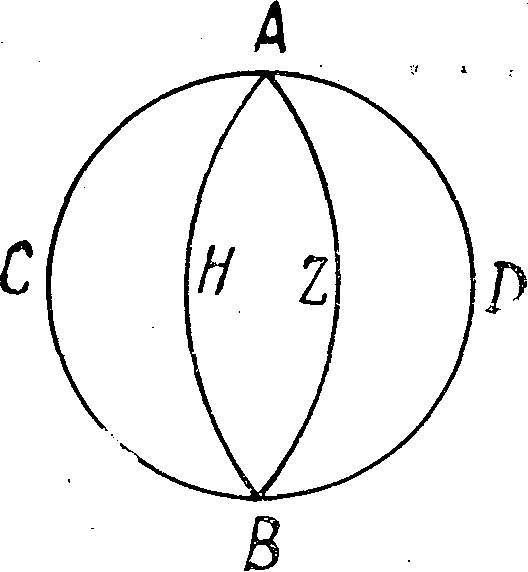 Пусть дана сфера ABCD с полюсами А—В и линией равноденствия СD. Пусть нагревание воздуха достигает предела между точками Н и Z, наиболее удаленными от (точки) А, потому что движение в том месте наиболее быстро. Затем, по мере приближения к полюсам, [22] нагревание уменьшается и, в конце концов, исчезает на полюсах. Тогда форма огня займет, как на этом изображении, внешнее положение, а форма воздуха — внутреннее. Это необходимо вытекает из предыдущего, тем более, что древние единогласно утверждают, что огонь имеет форму сферы окружающей, а воздух является сферой окружаемой. Из того, что я говорю, ничто не является обязательным, кроме нижеследующей фигуры: