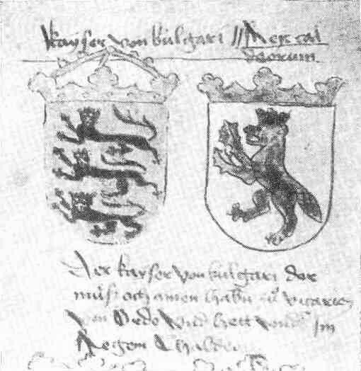 Констанцский бюргер и письмоводитель собора Ульрих Рихенталь написал свою «Хронику» на латинском языке между 1420 и 1430 гг., пользуясь документальными материалами, а также собственными воспоминаниями и заметками. Между 1425 и 1430 гг. художниками Швабской школы были созданы миниатюры на оставленных книгописпем чистых местах манускрипта. Им удалось запечатлеть важнейших участников и гостей собора, отобразить главнейшие события, а также многие гербы знатных делегатов и городов. На стр. 477 факсимильного издания Олендорфского кодекса приведен интересующий нас болгарский герб с надписью «Kayser von Bulgarien» 8 (см. рис. 1, слева). Любопытно, что рядом с ним изображен другой тип древнего болгарского герба — один лев, стоящий на задних лапах в угрожающей позе, в щите, с короною над ним и надписью «Rex Chaldeorum» (см. рис. 1, справа). Под обоими щитами надпись:
