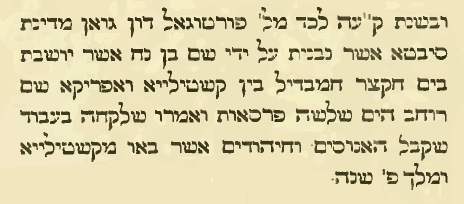 «И в год [5]175 [М. Э. 28], Дон Жуан, король Португалии, взял город Септу, каковой был возведен рукою Сима [Sem], сына Ноева; он расположен в море Пролива, что служит разделом между Кастилией и Африкой; и ширина моря там достигает трех парасангов 29; говорят, что [король Дон Жуан] взял его, поелику принял преследуемых и евреев из Кастилии. И [Дон Жуан] царствовал восемьдесят лет».
