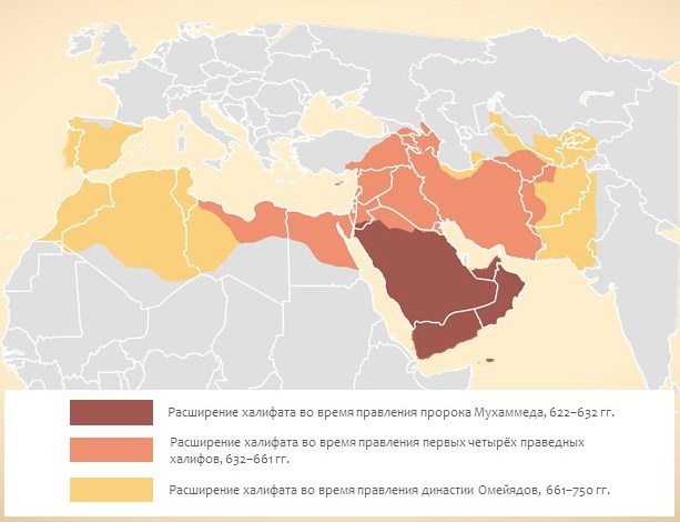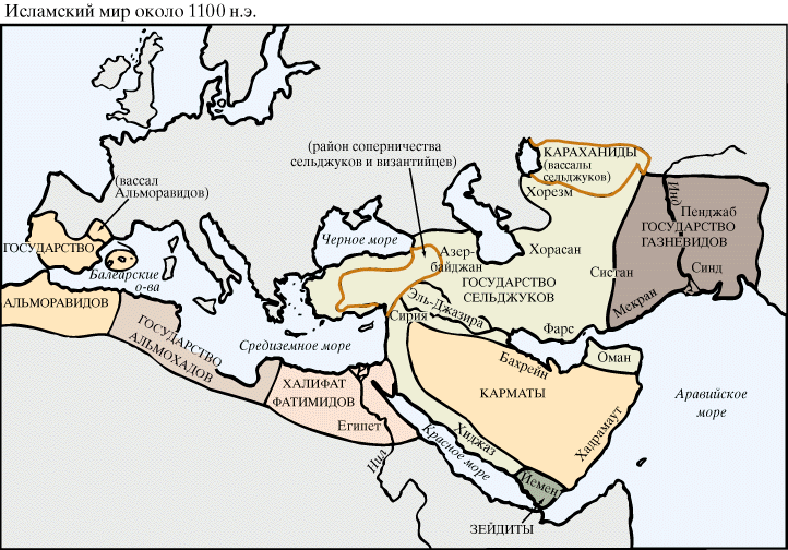 Некогда единый халифат, после трёх сменявшихся друг за другом периодов своего расцвета (Праведный халифат, Омейядский Халифат (династия Омейядов), и Абассидский халифат (династия Абассидов), в последнем из них под гнётом накопившихся политических, национальных и религиозных противоречий, перешёл в длительную стадию распада, начавшуюся в 8 веке, на множество государственных образований, самыми продолжительными по существованию, устойчивыми и значимыми из которых были Кордовский эмират в Испании (или Аль-Андалус, после 929 года — халифат; государство, с которым в течение 800 лет велась т.н. Реконкиста — отвоевание христианами Пиренейского полуострова), а также ключевые в регионе Фатимидский халифат (Северная Африка, Египет и отчасти Сирия и Палестина), Багдадский халифат (династии Абассидов, отчасти Сирия, Палестина, Иран и Афганистан), Малая Азия, Кавказ и Средняя Азия (позже Великое Сельджукское государство).