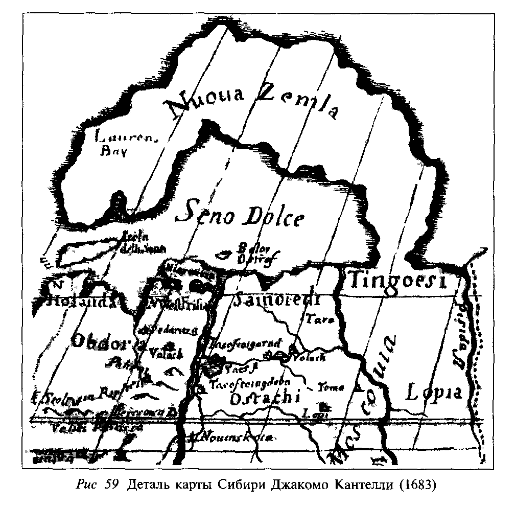 В конце XVII в. в Европе с новой силой возродился интерес к Северо-Восточному морскому пути в Китай и Восточную Индию мимо северных берегов Сибири, оставленному на долгое время после неудач английских и голландских экспедиций XVI в. Это стояло в связи с колониальной экспансией Англии и Нидерландов, с настоятельными запросами рынков этих государств; поводом же для возобновления этого интереса послужили новые географические данные о северных берегах Сибири, оказавшиеся в распоряжении европейцев. Хотя ко времени Алексея Михайловича относится составление любопытной записки «Описание чего ради невозможно от Архангельского города морем проходить в Китайское государство и оттуда к Восточной Индии» (напечатана С.А. Белокуровым в: ЧОИДР. — 1893, — № 4. — С. 13 и след.), но сведения, доходившие об этом в Европу, были совершенно иного порядка. Интересно, что в 1674 г. саксонский дипломат Лаврентий Рингубер предлагал русскому правительству обследовать речные системы Северной Сибири для установления удобного морского сообщения с Китаем и что в том же году русский посол в Саксонии С.М. Протопопов вывез из г. Готы «латинскую тетрадь, в которой предлагалось царю снарядить экспедицию для северо-восточного прохода» (Pierling P. Saxe et Moscou: Un medecin diplomate L. Rinhuber de Reinufer.— Paris, 1893.— P. 43—44; Relation du voyage en Russie fait en 1684 par Laurent Rinhuber. — Berlin, 1883. — P. 91, 132, 140). Около того же времени в западноевропейской печати опубликованы были некоторые новые данные по этому вопросу, послужившие, однако, причиной ошибки, довольно долго державшейся в литературе и картографии.