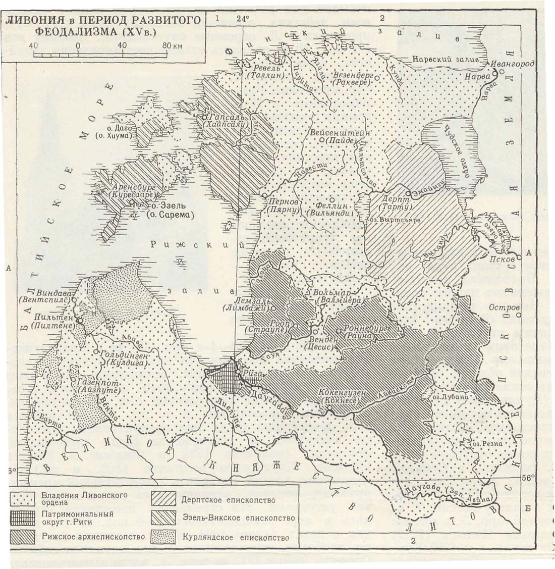 Ливония к XV в. (281 кб). Источник: Советская историческая энциклопедия. М. 1976 (Любезно предоставлена Дьяконовым И. В.)