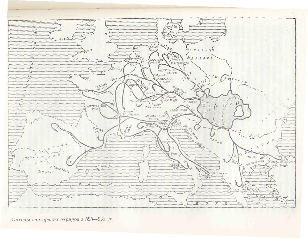 Походы венгров в IX-X вв. (225 кб). Источник: История Венгрии. М. 1971. (Любезно предоставлена Дьяконовым И. В.)