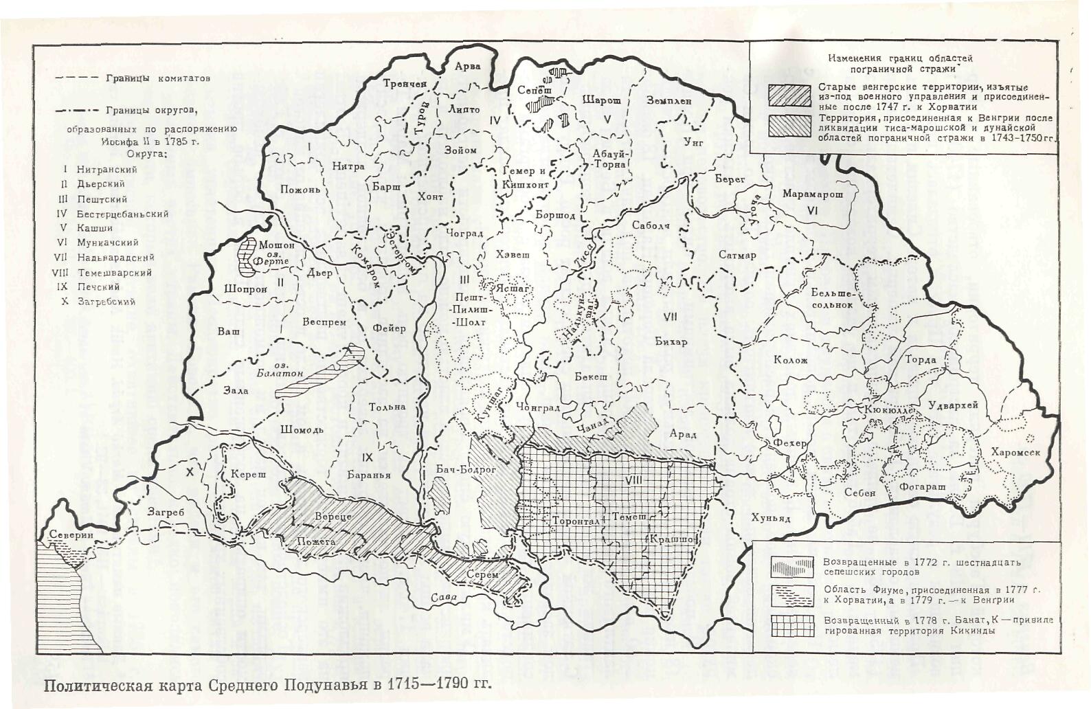 Политическая карта среднего Подунавья в 1715-17 (208 кб). Источник: История Венгрии. М. 1971. (Любезно предоставлена Дьяконовым И. В.)