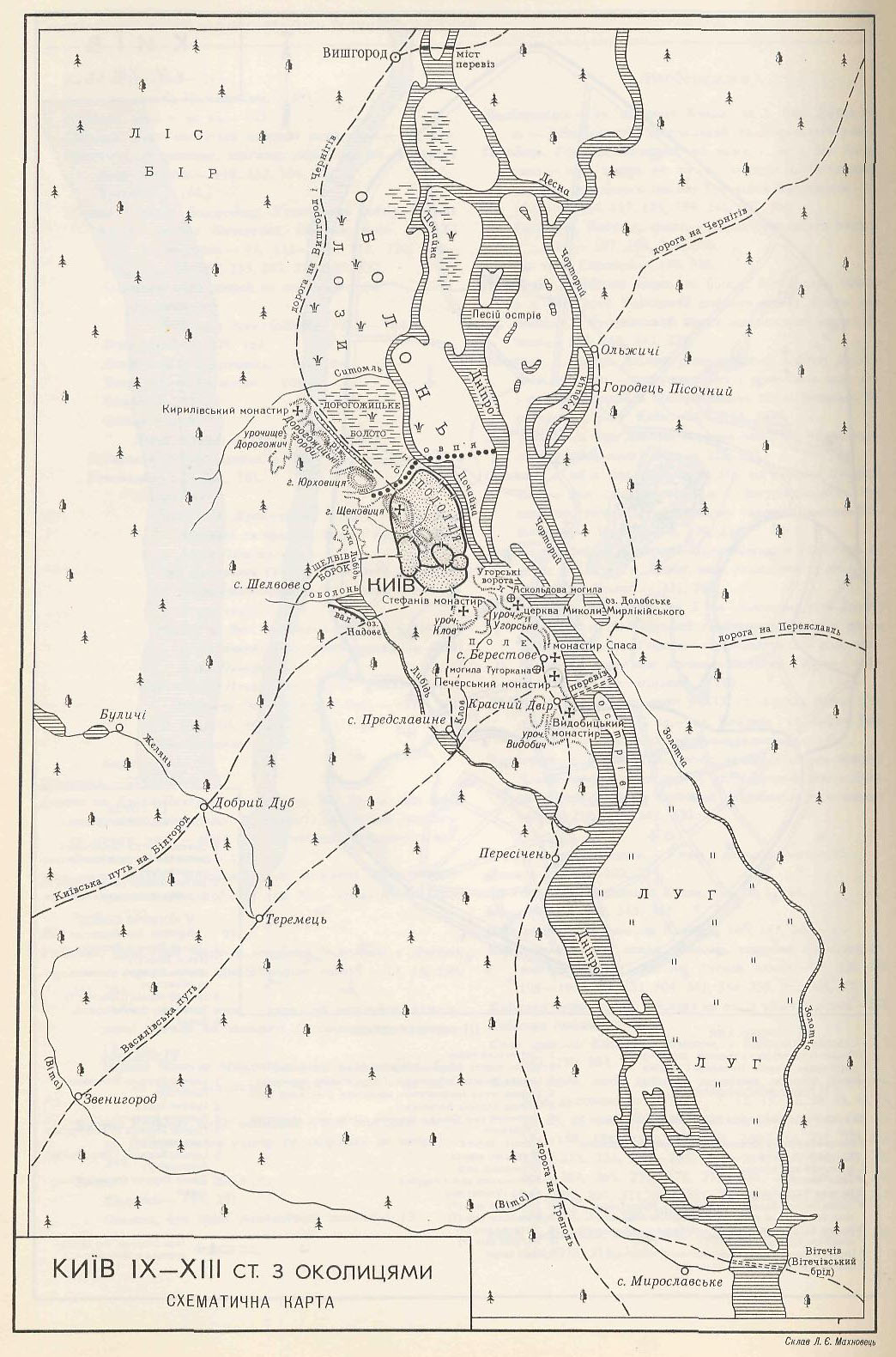 Киев 11-12 вв с окрестностями. (385 кб). Источник: "Лiтопис руський". Киiв, вид. Днiпро. 1990 (Любезно предоставлена Дьяконовым И. В.)