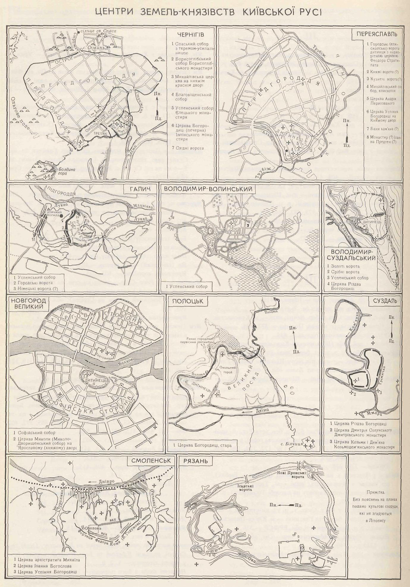 Планы княжеских центров Киевской Руси (Чернигов, Переяславль, Галич, Владимир-Волынский, Владимир-Суздальский, Новгород Великий, Суздаль, Смоленск, Полоцк, Рязань). (616 кб). Источник: "Лiтопис руський". Киiв, вид. Днiпро. 1990 (Любезно предоставлена Дьяконовым И. В.)