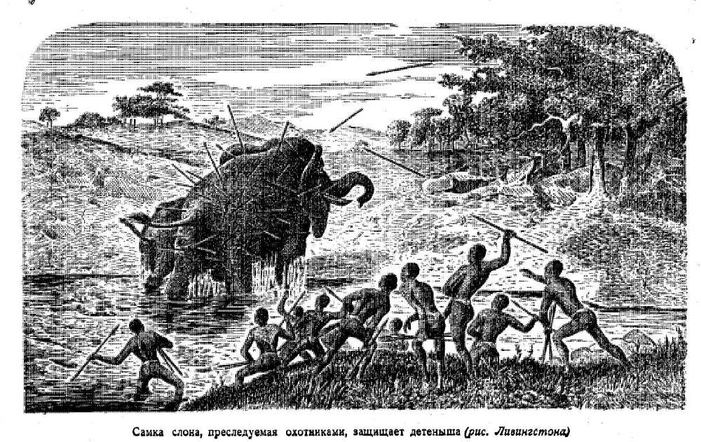 Слониха, преследуемая охотниками.