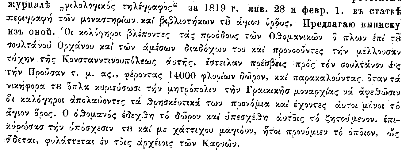 Книги печатные вообще состоят из сочинений полезных в богословском отношении. В некоторых библиотеках находятся полные издания отцов церкви и более или менее полные собрания Византийцев, а также, как нпр. в иверской, старые издания классиков Альдов и Стефанов. Рукописи вообще богословские; после кодексов свящ. писания и отцов церкви большое количество книг нотных (jaltika) и номоканонов. Недостаток и небольшое достоинство рукописей славянских замечательны. Вообще могу утверждать с достоверностью, что в афонских монастырях нет искомых славянских рукописей. Хотя некоторые можно назвать достопримечательными, нет однакож, за исключением глаголитской в Зографе, древнее рукописей XII ст., очень малое количество XIII ст. и самое большое XIV и XV стол. Совершенный недостаток исторических и большое число богословских рукописей. Были ли прежде на святой горе многие глаголитские рукописи и даже знали ли их, теперь трудно решить. В настоящее время не имеют об них никакого понятия. Глаголитское евангелие, открытое г. Михановичемъ не почитали за славянское. Мне кажется, что глаголита заходила сюда случайно из других мест. Кроме зографского м. она случалась и в других монастырях. Свидетельством сего последнего служит неполная ркп. евангелия, писанного глаголитскими буквами, о которой расскажем впоследствии.