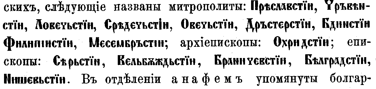 Предварив о недостаточности сведений, сообщенных путешественниками о местах этих, справедливо, кажется мне, утверждать могу, что всякое, как ни скудное, прибавление к ним почтено будет не лишним, может быть, даже полезным. С этою целью позволил я себе приложить при очерке своем список мест, [177] дополняющих хорографию южных болгарских земель. Список этот заимствован из поменика монастыря Слепче и заключает именно названия поселений пройденных мною стран. Упомянутый поменик писан в ХVI столетии и отличается особенно подробным показанием сел и городов, откуда происходили записываемые лица. Незнаю приличнее места для них, как в этом очерке, сухом конечно, но не скудном, смею думать, на материалы для топографии малоизвестных стран.