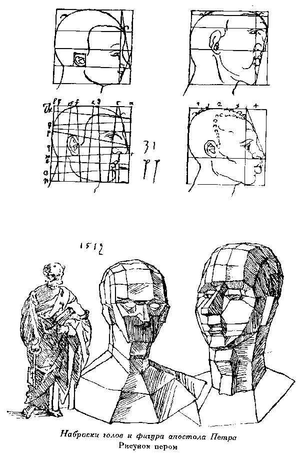 12. Наброски голов и фигура апостола Петра, Рисунок пером. Дрезден, Публичная библиотека.
