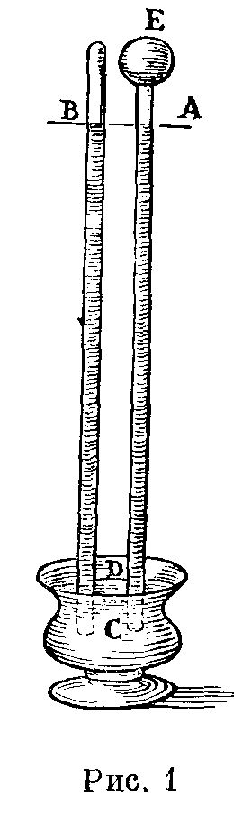 Мы сделали много стеклянных сосудов, подобных тем, которые изображены здесь и обозначены буквами А и В, — широкие, с шейкой длиною в два локтя 6. Когда они были наполнены ртутью, а затем отверстие закрывалось пальцем и сосуды эти погружались в сосуд С, где находилась ртуть, можно было видеть, что они становились пустыми и ничего не поступало в опустошающийся сосуд; однако шейка AD оставалась всегда наполненной до высоты l 1/4 локтя и еще одного пальца. Дабы показать, что сосуд был совершенно пустым, нижняя чашка наполнялась водой до D, и если сосуд постепенно поднимали, можно было видеть, что когда отверстие сосуда достигало воды, ртуть опускалась из шейки, а вода целиком наполняла сосуд со страшным напором (con irnpeto horribile) вплоть до знака Е. Пока сосуд АЕ был пустым и ртуть, хотя и обладающая большой тяжестью, продолжала держаться в шейке АС, мы рассуждали так: до сих пор существовало мнение, будто сила, не позволяющая ртути, вопреки ее природному свойству, падать вниз, находится внутри сосуда АЕ, т.е. заключается либо в пустоте, либо в веществе, предельно разреженном; однако я утверждаю, что эта сила — внешняя и что сила берется извне. На поверхность жидкости, находящейся в чашке, действуют своей тяжестью 50 миль воздуха. Что же удивительного, если ртуть, не имея ни стремления, ни отвращения находиться в стеклянном сосуде СЕ, проникает туда и поднимается настолько, чтобы уравновесить тяжесть наружного воздуха, который ее гонит.