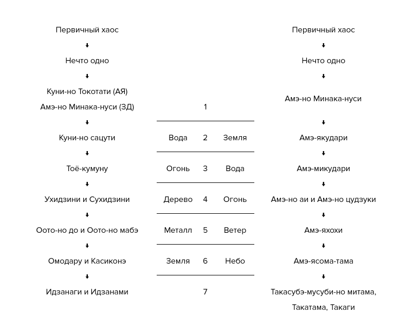 На практическом уровне «путь богов» требует «чистоты» (хараи). Учение Ватараи понимает ее как внутреннее состояние: «считать изначальное изначальным» (так в «Житии Ямато-химэ» и других текстах). Как эта внутренняя чистота соотносится с внешними жреческими запретами? Иэюки разбирает этот вопрос, соотнося шесть главных запретов с шестью познавательными способностями (пять чувств и ум). Они, в свою очередь, соотносятся с первым божеством и следующими пятью поколениями богов. Иэюки сопоставляет два перечня богов из разных летописей, ставя их в соответствие двум спискам первоэлементов: из китайских классических книг и из буддийских (см. схему). При этом древних богов нельзя назвать божествами воды, огня и т.д. — их функции далеко не столь определенны. Но ведь и первоэлементы не сводятся к стихиям видимого мира. У китайских мудрецов «вода, огонь, дерево, металл и земля» скорее обозначают сменяющие друг друга состояния мирового «дыхания», энергии (ки, кит. ци), им ставятся в соответствие пять главных органов человеческого тела. А у буддистов «земля, вода, огонь, ветер и пространство» — это пять факторов воспринимаемости познаваемого предмета (его осязаемость, доступность вкусу, видимость, обоняемость и слышимость). Прослеживая все эти соотношения, приверженец «пути богов» вместе со своим наставником-жрецом узнает, что в его собственном теле, в познавательном опыте и в опыте обрядовых действий присутствуют и первые боги, и то начало, откуда они пришли. [140]