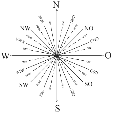 — румбами называются направления на различные предметы, измеряемые углами между линией север-юг (N—S) и этими направлениями. Во времена парусного флота, когда к мореплаванию не предъявлялись такие требования точности, как в настоящее время, истинный горизонт (как и картушка компаса) делился на 32 румба, причем румбами называлось как каждое из этих направлений, так и углы между двумя ближайшими целыми румбами. Исходя из того, что каждая окружность подразделяется на 360°, величина одного румба в градусах составит 11°15', т.е. 11 1/4°. Петр I ввел в русском флоте голландские наименования румбов, помещенные на прилагаемом здесь чертеже. Левая часть этого чертежа показывает, что истинный горизонт (и картушка компаса) делится на 4 четверти: норд-остовую, зюд-остовую, зюд-вестовую и норд-вестовую (см. чертеж), причем в каждой четверти нумерация румбов велась по направлениям стрелок. Правый чертеж приводит наименования румбов. Буква «t» обозначает сокращенное испорченное голландское слово «тен», т.е. «к»; так что румб NOtN следует произнести «норд-ост-тен-норд»; если при обозначении какого-либо направления требуется большая точность, чем 11 1/4 °, то добавляется в соответствующую сторону дробная часть румба, с точностью до 1/4 румба, например WNW1/4 W, т.е. «вест-норд-вест четверть к весту» (в настоящее время истинный горизонт и картушка компаса делятся на 360° и курсы и пеленги отсчитываются с точностью до 1/4°, по часовой стрелке). Пользуясь вышеуказанным делением истинного горизонта на румбы, говорят «корабль идет по такому-то румбу» (т.е. курс корабля будет такой-то) или «маяк виден по такому-то румбу» (т.е. пеленг маяка будет такой-то).Деление катушки компаса на румбы