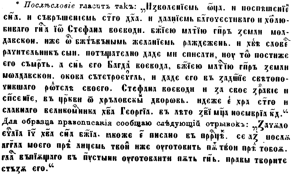 К сожалению, слухи о существовании в Цетинье пергаменного Евангелия, чуть ли не современного Остромирову, не оправдались: я не нашел ни одной древней рукописи. Самая старая рукопись есть пергаменное Четвероевангелие in 8°, писанное красивым уставом, как видно из послесловия, 4 [25] при молдавских господарях, Стефане и сыне его Богдане, до 1504 г.; оно было занесено в Черногорию, как значится в приписке, одним молдавским купцом и оковано владыкою Даниилом в 1732 г. Другое такое же Четвероевангелие с предисловием Феофилакта, архиепископа болгарского, писано при патриархе пекском Герасиме, а третье — скорописное, времени патриарха Арсения. В ризнице хранятся также царские грамоты и разные письма XVIII-XIX ее. а также архиерейские облачения и ордена, Жалованные нашим правительством черногорским владыкам.