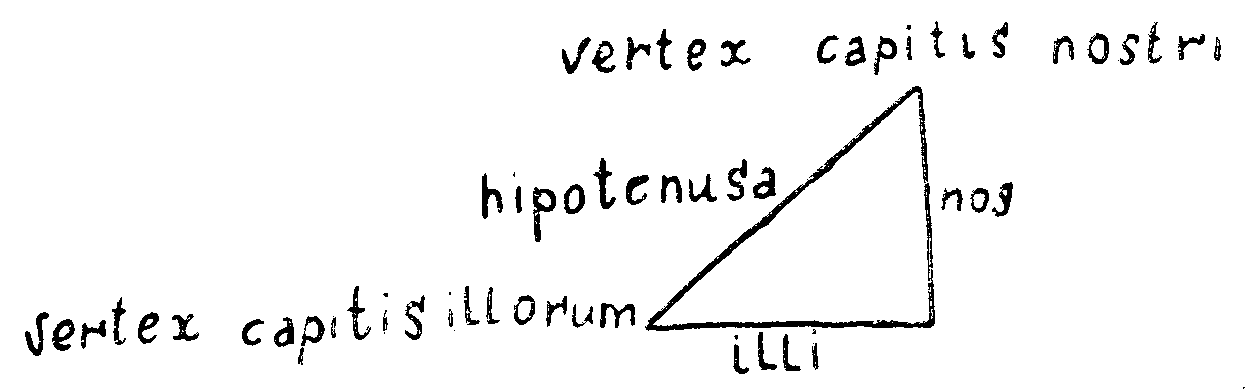 Чтобы ты яснее это понял, представь себе следующее: перпендикулярная линия, которая, когда мы стоим прямо, падает от точки неба над нашей макушкой на нашу голову, у них попадает на бок или на ребро. Поэтому получается, что для того, чтобы мы находились на прямой и одновременно на поперечной линии, должна образоваться фигура прямоугольного треугольника, линию катета которого мы сами занимаем, основание же и гипотенуза тянутся от нас и к их макушкам, что и видно на этой фигуре, и это мнение подкрепляется космографией.