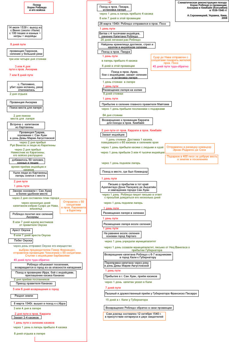 Сначала, 14 июля 1539 года, в силу полномочий, полученных от Его Милости, со ста мужчинами пешими и конными, с жителями островов и с людьми, на войне подвизавшимися, потратив много времени в этих краях, он привёл [сюда] много скота и негров и индейцев в качестве поселенцев и завоевателей. И в селении, известном как Вихес [Vijes], принадлежащего индейцам, там он разместил свой лагерь и осуществил смотр своим людям и всего остального. В вышеупомянутом лагере были очень знатные кабальеро и другие люди чести, шедшие с ним заодно, и туда пришли другие кабальеро и честные люди, жители города Кали, попрощаться с сеньором Капитаном. И откуда через два дня он ушел из вышеупомянутого поселка Вихес, и привел в порядок свой передовой и тыловой отряды, [а также] остальных и глав отрядов, [состоящих] из всадников и пеших; и волею Господа с этим порядком он вышел. А вышеупомянутые кабальеро вышеназванного города Кали вышли с ним [и прошли] приблизительно одну лигу, и там простились с сеньором Капитаном и с другими кабальеро; и это прощание было таким сердечным, что у всех у них лились слезы из-за большой любви и дружбы, существовавших между ними издавна; и так попрощались те, что из города Кали, а сеньор Капитан продолжил свой путь к провинции Ансерма; чтобы осуществить то, что он вменил себе в обязанность.