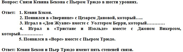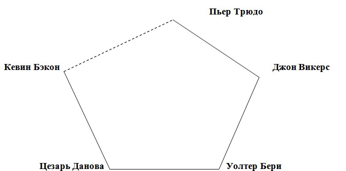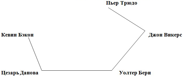 Данная концепция представляется мне как форма пустяковой игры, в которой игроки связаны попарно, по – видимому не имеют отношения к известному нам незначительному числу родственных связей. Данные связи будут говорить о вычислении близости или дистанции между двумя знаменитостями, подсчитывая и предоставляя нам степень их различия. Проиллюстрируем, как начинается игра в шесть уровней. Это трудный путь для подсчёта, однако, мы применим его ниже. Наши две знаменитости это популярный Голливудский актёр Кевин Бекон и покойный канадский премьер – министр Пьер Эллиотт Трюдо:
