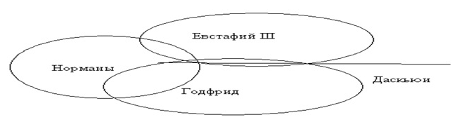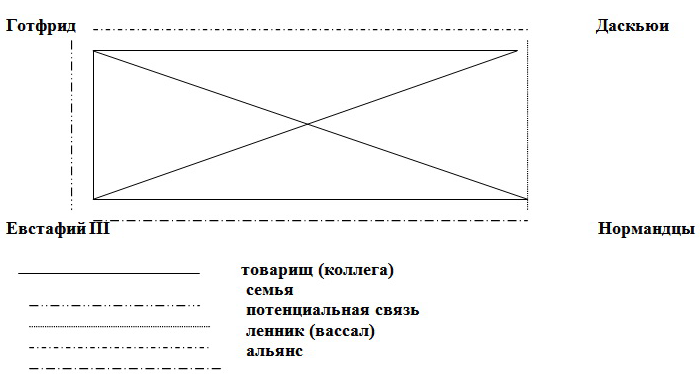 Сейчас, когда отдельные связи были преобразованы в систему уровней, это позволяет нам рассмотреть связи в целом. На примере, мы можем начертить диаграмму отношений между лордами, их вассалами и коллегами; в данном примере будут участвовать Готфрид, его вассал Даскьюи, его брат Евстафий и Роберт Нормандский. В виде окружностей визуально изобразим сферы влияния, которые характеризует связи, наша первая диаграмма должна выглядеть так.