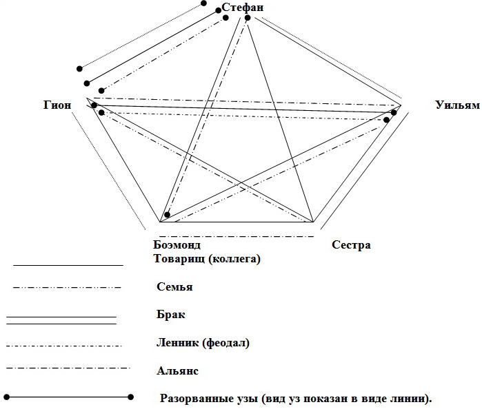 Итак, в течении продолжительного времени, мы имели только план, который базировался на взаимной связи. Ещё среди Крестоносцев мы можем рассмотреть другие связи, включив в них семейные, товарищеские, соседские и иные союзы, как показано выше (Равно имеют силу среди Крестоносцев общность языка и религии, что здесь нужно ставить отдельно). Так становится возможным, через линейную диаграмму, записать природу межличностных связей, которые прями рассматриваются, а также потенциальных связей, пока они не стали очевидными.