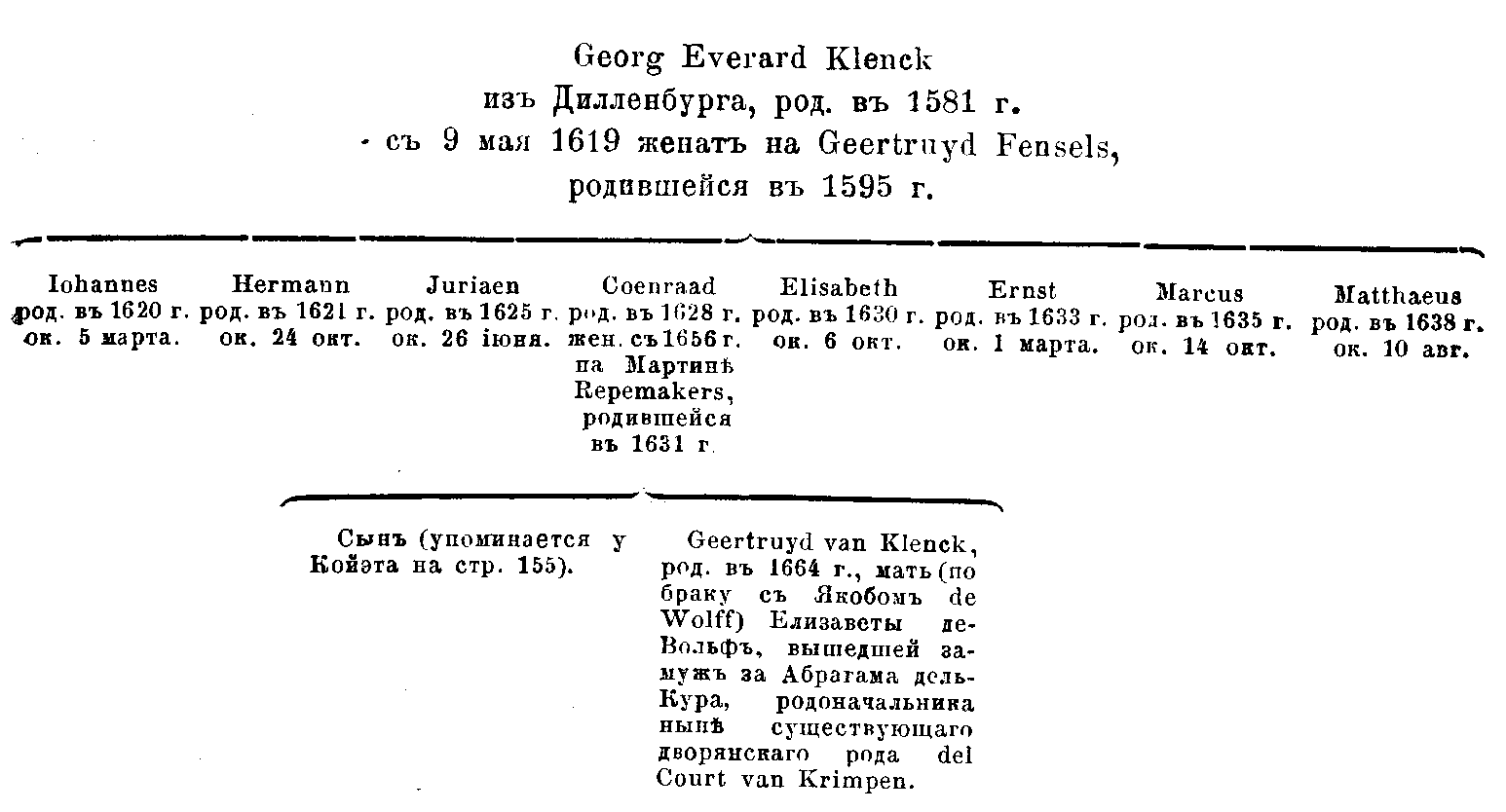 Семья Кленков не Амстердамская по своему происхождению, а пришлая, из Нассау-Дилленбурга. Документы Амстердамского общинного архива (Gemeente Archief) дают возможность установить следующую родословную Кленков: [XII]