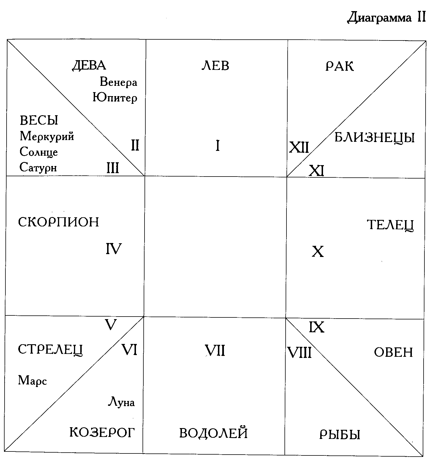 Марс, управитель четвертого знака [Скорпиона], расположен в Пятом доме. Его (Акбара) почитаемый предок будет помогать ему из своего места 27 небесной тайной помощи, и его благородные дети будут долго жить и станут великими и знаменитыми в своей власти и судьбе. Юпитер, управитель пятого знака (Стрельца), находится во Втором доме. Он (Урожденный) будет обладать обширными сокровищами, и великие страны будут под его властью. И так как Венера также находится во Втором доме, он будет проницательным и различающим музыкальные ноты 28 в величайшей гармонии и сокровенных мелодиях. Сатурн 29, управитель шестого знака (Козерога), находится в Третьем [доме], поэтому некоторые из его (Урожденного) слуг будут иметь злобные мысли, но будут подавлены стопой его гнева.