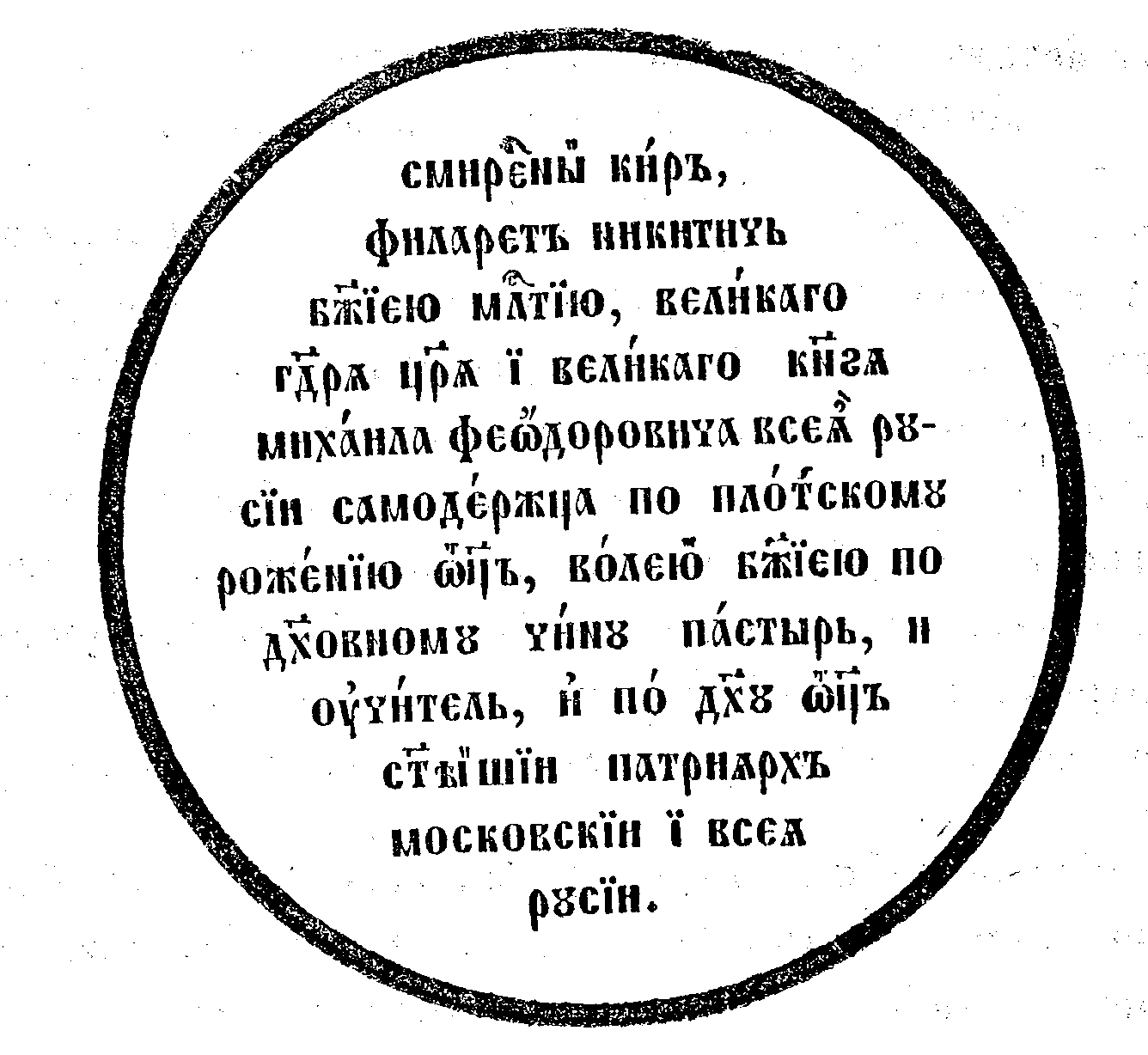 Когда Русские снова сделались господами в своей стране, то они выбрали и возвели на престол Великим Князем Михаила Федоровича, что случилось в 1613 году. Отец Михаила был Федор Никитич (Fedor Nikititz), один из родственников Царя Ивана Васильевича. Оставив супружескую жизнь, Федор [241] Никитич поступил в монашество и избран был (позднее) в Патриархи, когда переменил свое имя и стал называться Филаретом Никитичем. Великий Князь Михаил Федорович, будучи от природы благочестивым и богобоязливым, оказывал своему отцу, во все время его жизни, всякую честь и сыновнее послушание. Так, когда иностранные Послы являлись к Его Царскому Величеству, то он сажал отца своего, со всем его клиром, на торжественных представлениях, по правую свою руку. Патриарх этот скончался не задолго до нашего прибытия в Москву, именно в 1633 году. Печать его была следующего виду: